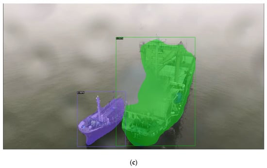 The results of the experiment in Table 3 show the comparison of segmentation performance by additionally training the backbone networks of R50-C4 3x, R50-DC5 3x, and R50-FPN 3x for Mask R-CNN. All three backbone networks show relatively high performance, and R50-FPN 3x 5000 has the highest result. Comparing images (Figure 8a–c) shown in Figure 8, the resulting images using the R50-C4 3x backbone network recognized the shape of the ships and large structures. However, this had a limitation in that many of the thin structures of the ships were not recognized. The resulting images using the R 50-DC5 3x backbone network (Figure 8b) showed improved performance compared to (Figure 8a). The resulting images using the R50-FPN 3x backbone network (Figure 8c) were able to recognize the structures that were not recognized in (Figure 8a,b), and it has a more precise recognition rate of distinguishing between ships and structures.