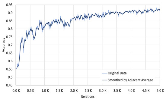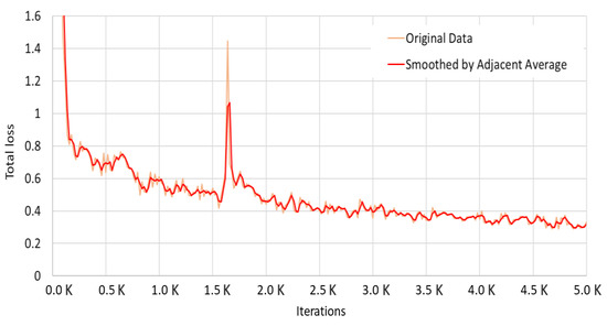 As shown in Figure 10, Mask R-CNN showed an accuracy of about 90% starting with 3500 learning experiences, which converged to about 95% with additional learning up to 5000 times. We checked the loss curve of the Detectron2 model for additional performance evaluation and used Google Colab GPU for 5000 iterations. We tracked the total loss value using TensorFlow and confirmed the curve shown in Figure 11. We could confirm that the total loss value decreases as the learning iterations increase and finally reaches about 0.3.