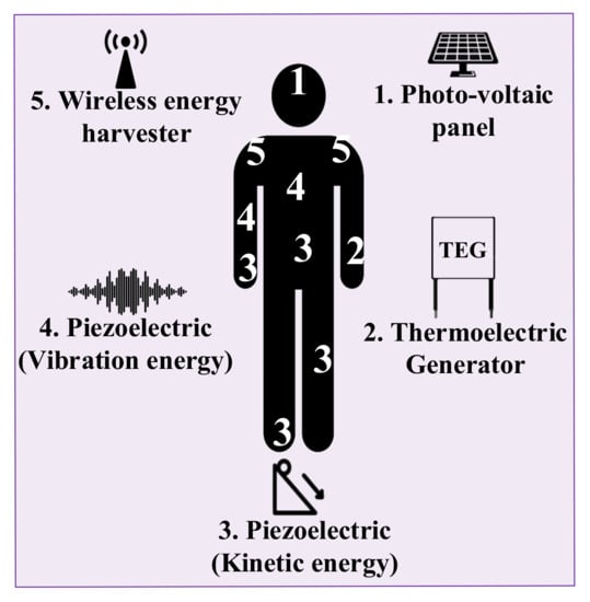 | Human body motion | Piezoelectric | 0.021 µW/ |