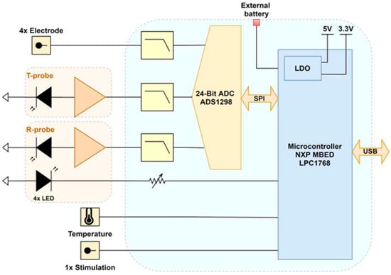 Block diagram of the multimodal device, with various probes on the left and the acquisition board on the right (SPI: Serial Peripheral Interface; ADC: Analog to Digital Convertor; LDO: Low DropOut).
