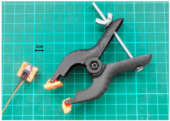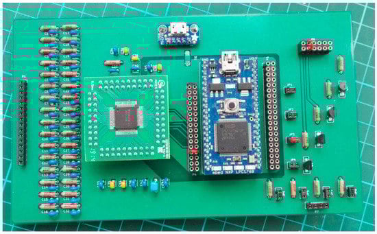 An SMT160-30 digital output temperature sensor (Smartec®, Breda, The Netherlands) is included and is directly connected to the MCU. A synchronized digital input to follow stimulation completes the system. The LEDs can be commanded by a driver module running on the MCU, which is connected to the common anode of the light sources. However, additional Bipolar Junction Transistor (BJT) circuit is also present to drive higher LED current and, therefore, to have a more important optical intensity. A photograph of the acquisition board, made from an FR4 Printed Circuit Board (PCB), can be seen in Figure 2.