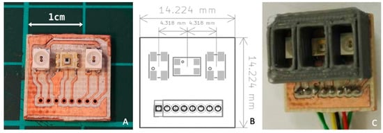 For the R-probe, we designed a custom FR4 PCB in order to combine the light sources and the optical sensor. The probe dimensions (14.2 mm × 14.2 mm) are compatible with the primary application [16]. As can be seen in Figure 5A, two dual wavelength LEDs are placed on both sides of the TSL12T. The light sources are equidistant from the photodetector, allowing a cross-comparison of the extracted parameters from the two pairs. This probe is positioned directly in contact with the spinal cord. Because of the need to adapt the probe design to the local anatomical constraints, we had to choose a short distance between the photosensor and the LEDs (4.32 mm, see Figure 5B), and as a trade-off in order to obtain the best response for the four wavelengths. This short distance may result in a low diffusion depth that must be taken into account when interpreting the results. Liquide epoxy was applied to the whole surface of the PCB tracks and pads to waterproof the probe during in vivo animal experiments, leaving the optical windows of the optoelectrical components untouched. Moreover, a series of optical barriers of different heights were developed to reduce self-glare and direct-light. Figure 5C shows the 3 mm high walls used during the experiments.