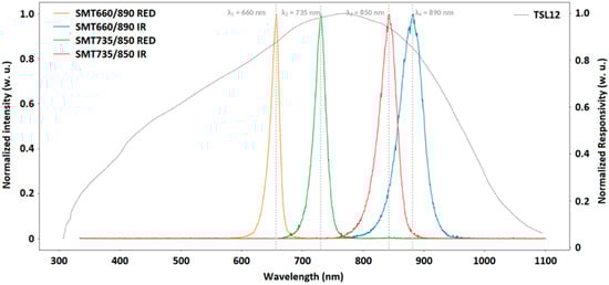 In accordance with the chromophores that we aimed to monitor [17,18], we chose the Marubeni® SMT660/890 and SMT735/850 LEDs. Note that green LED is not suitable due to its low penetration depth in tissue. The LEDs’ optical characteristics had been measured previously, such as the peak wavelength and the Full Width at Half Maximum (FWHM), and they showed good compatibility with the photodiode′s spectral responsivity (Figure 6). The protocol of the optical characterization is described in a previous study [19].