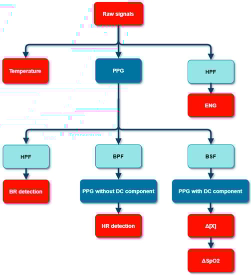 After reception, offline analysis of signals was performed with MATLAB, MathWorks, on the base station to improve the data quality and extract relevant information, which are for us ENG, Breath Rate (BR), Heart Rate (HR), the chromophore concentration changes (Δ[X]) and the oxygen level evolution (ΔSpO2). In particular, high-order filters were used to improve the Signal-to-Noise Ratio (SNR), while minimizing group delay and with flat response in the passband, which could deform the signals’ shape [20]. As illustrated by Figure 7, from raw signals, ENG is directly observed after High-Pass Filter (HPF). It is a 2000-order Hamming Finite Impulse Response (FIR) with a cut-off frequency of 100 Hz. Additional LPF has no positive effect on parasitic signals and intrinsic noise. Concerning PPG signals, the pre-processing to obtain the BR only requires the removal of the Direct Current (DC) component. This is achieved using a Blackman HPF with a cut-off frequency of 1 Hz. For the HR, a Band-Pass Filter (BPF) was chosen (a 0.5 Hz 2000-order Hamming HPF associated with 5 Hz 2000-order Blackman LPF). Conversely, concerning the obtaining of the concentrations’ variation, it is the rejection of a specific band, with a custom Band Stop Filter (BSF), which is recommended. In particular, the contribution of breathing is now removed without modification of the DC component. After this shaping of the raw signals, it is possible to obtain the physiological parameters.