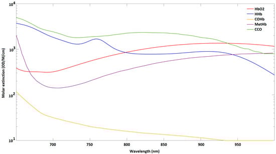 To monitor the functional status of the SC, the blood composition in this region of interest is indeed primordial in association with HR and BR. Four different wavelengths were chosen to detect changes in the concentration of four different substances in the SC blood thanks to PPGs. Figure 8 shows the molar extinction coefficients of the main substances of interest in blood in function of the light wavelength based on the literature [21]. We decided to observe the concentration changes of HbO2, HHb, MetHb and CCO [22]. The carboxyhemoglobin (COHb) was not selected due to its relatively small value compared to the other substances, and its low concentration in this study.