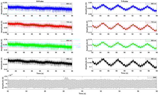 Temporal evolution of the raw PPG signals in baseline, obtained simultaneously with the reflection mode (R-probe) and the transmission mode (T-probe), for the four selected wavelengths and raw biopotential (s: second; V: volt).