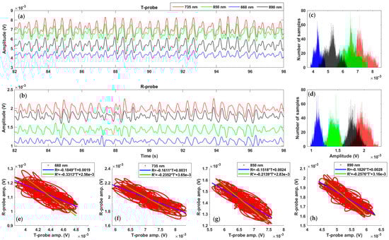 PPG results in baseline for the four wavelengths in both modes ((a): transmission, (b): reflection) and example of signal processing result ((c,d): histogram of both PPG, (e–h): PPG clouds of dots allowing the calculation of the Bravais–Pearson correlation coefficients and regression analysis).