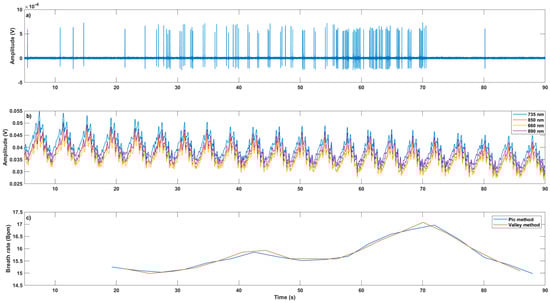 Figure 11 presents the case study where current pulses are applied. We have five different phases (see Figure 11a). At the beginning and end, no intensive stimulation is carried out. Between 26 s and 40 s, a first series of pulses is performed. Then, until about 55 s, the stimulation is slightly less intense and, finally, between 55 s and 70 s, trains of pulses are sent, similar to what happens for the evoked potentials. As shown in Figure 11a,b, the relation between the electrical stimulation of Figure 11a and the optical signals behavior is not clearly visible. However, after the processing presented in Section 2.1.3, relevant information with high added value can be obtained. As an example, Figure 11c represents the calculation of the spontaneous breathing (the plot delay is due to the computation method used). Beginning around 15 Bpm, BR perfectly follows the trend associated with the five stimulation phases.
