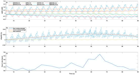 In Figure 12, the resulting temporal variation in the four main blood chromophores’ concentration (Δ[X]), ΔSpO2 and the HR are proposed. We can clearly observe how the HR increases along with electrostimulation. Concerning Δ[X] and ΔSpO2, the breathing requires us to smooth the curves in order to be able to deduce a trend. We see the benefit of using more than two wavelengths when we look at the SpO2 variations. With only two light sources (raw classical in Figure 12b), no variation is detectable. On the other hand, with the four selected wavelengths (raw multiwavelength), a trend similar to the one observed with HR can be identified.