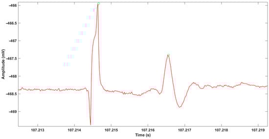 Concerning the ENG aspect, Figure 13 shows an example of the variation in biopotential at the level of the SC. It was obtained thanks to the MP36R with a resolution of 200 kSps under 24 bits. This curve was obtained after filtering and, above all, an overall average over 15 periods in order to extract signal from noise. We can see a first pulse due to the electrical stimulation and, about 1.9 ms later, the sign of the neurons’ recruitment, with their associated oxygen consumption.