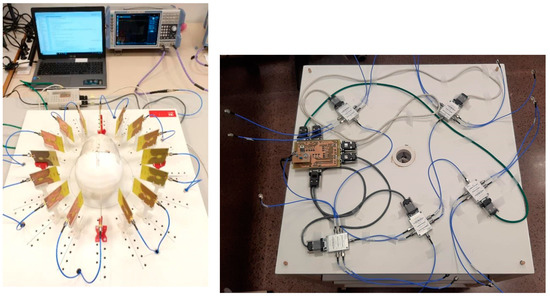 Figure 1 (left) shows the microwave imaging system. Briefly, it is made up of 16 wideband twin antennas located at equally-spaced points throughout a circumference with a diameter 34 cm—i.e., one antenna every 22.5°—around the area where the object under study is located, in this case a cranium 3-D model. This configuration leaves a space of 20 cm to place the model in the center of the circumference. Each antenna is held by a 3-D-printed holding piece, and the 16 antenna–holder pairs are screwed onto the top face of a wood board. All the antennas are connected by means of a high-frequency switching network to Port 1 (the port under use) of a Vector Network Analyzer (VNA) to perform all measurements (Rhode and Schwarz ZNLE6). An Arduino Due microcontroller is used to control the electronic switches so that only one antenna is active at the same time. Both the switches and the control system are located in the bottom face of the wood board, at a sufficiently far position under the antennas in order to avoid interferences in the measurement process. The whole system is controlled with a computer which executes Python script that automates the entire process. This script is in charge of the communication with both the VNA and the microcontroller. It therefore controls which antenna is connected to the network analyzer at each time, as well as the measurement files transfer between the VNA and the computer. It is also in charge of loading the measurement data into a MATLAB script that performs the signal processing and generates the images for the surgical navigation. The different parts of the system will be further described in the next paragraphs.