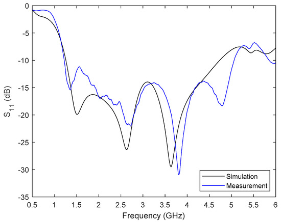 One of the antennas was placed inside an anechoic chamber to carry out a standard characterization. Firstly, the return losses were characterized by means of the scattering parameter S11. The results of both the simulated and measured response are plotted together in Figure 3. An acceptable agreement can be seen, thereby validating the design, optimization, and implementation processes. The experimental operating frequency range of the antenna is from 1.2 to 5 GHz (for S11 < −10 dB), which means 123% bandwidth for a central frequency of 3.1 GHz; thus, confirming its wideband nature. Secondly, the antenna radiation patterns were measured by employing a horn antenna as a reference. The measurement characterization of the antenna in terms of the E-plane and H-plane radiation diagrams at specific frequency points can be seen in Figure 4. It is worth noting that the designed antenna has a higher directivity in the E-plane (the aperture plane), especially at higher frequencies. Following these steps, the 16 involved antennas were characterized, obtaining well-nigh identical results.