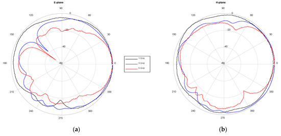 Measured antenna radiation pattern at specific frequency points: (a) E-plane; (b) H-plane.