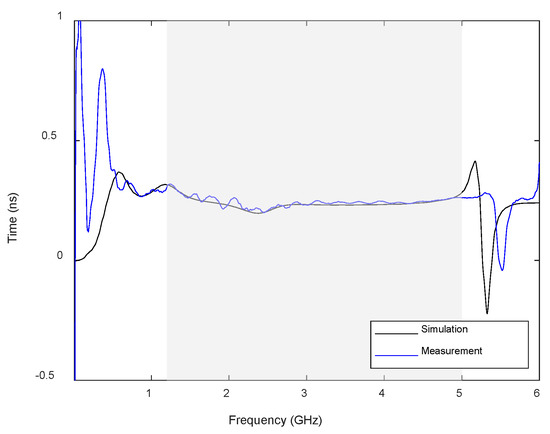 Measured and simulated group delay for the proposed antenna (the shadowed area indicates the antenna bandwidth).