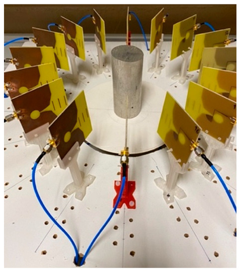 Once the hardware system and the algorithms used to obtain the image of the elements under study have been described, the tests carried out for the start-up and calibration of the system will be presented in this subsection. The calibration of the imaging algorithms was based on measurements and imaging of a metallic cylinder of 5.0 cm diameter and 11.5 cm height. Figure 6 shows a picture of the cylinder together with the antenna system.