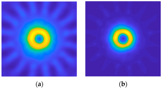 After placing the metallic cylinder in the center of the structure, equidistant from all the antennas, the measurements and the processing of the obtained data were carried out. The resulting images for DAS and DMAS algorithms are shown in Figure 7. As it can be seen, an image of the metallic cylinder edge is obtained with a high intensity representation, in yellow color, corresponding to its real dimensions. It can also be seen how some light-blue-colored areas appear, which are related to the signal reflected by the cylinder and rebounded in the metallic parts of the neighbor antennas before being received by the active antenna at each moment. These reflections are more attenuated in the DMAS algorithm, which offers a clearer image (and shape) of the object for the considered setup.