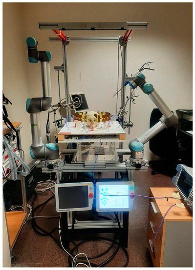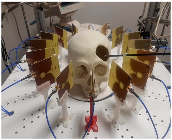 Once the system was implemented and calibrated, its performance as a cranial surgery navigation tool was assessed. The targeted application consists of detecting the position of the surgical tool within the cranial area, so that the surgical team is provided with proper guidance and assistance. In order to emulate such a scenario, a setup imitating an operating room for cranial surgical interventions with robotic tools was prepared, as shown in Figure 8. As it can be seen, a structure was designed to hold the antenna system, allowing to house the 3-D-printed cranium in the exact center. Ad hoc connection of the antennas to the VNA and the computer was installed, as explained in the prior sections, to allow the proper running of the microwave image system. Finally, a UR5 robotic arm was used to emulate the surgeon’s moves. The robotic arm was configured to hold the clinical tool, which is intended to navigate towards the critical area within the cranium.