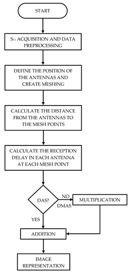 DMAS algorithm [28] is a variant of the DAS algorithm in which a multiplication of the calculated delays is performed for each pair of signals obtained using the measurement system. This way, the coherence or correlation between the reflections and the precision in the representation of the images are increased. Being ⊙ the element-wise product operator, the analytical formulation for DMAS is: