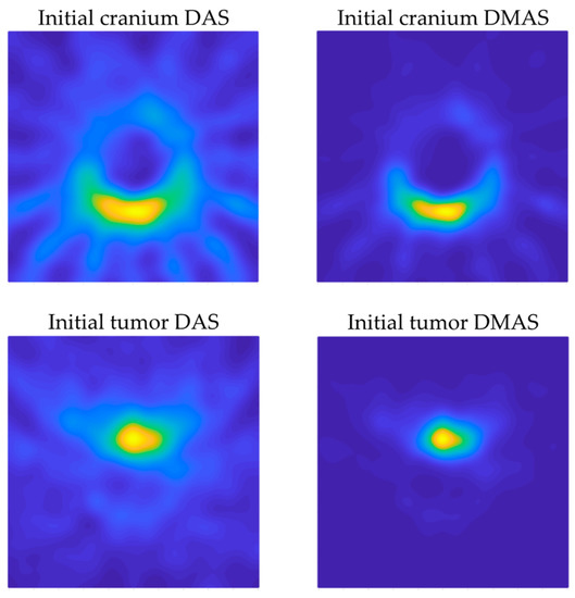 Figure 12 shows the capability of the proposed system to scan the cranium and detect the tumor within the experimental setup considered here. Both algorithms show acceptable detection capabilities in this regard. Considering the images in which only the cranium is involved (Figure 12 top), the DAS algorithm provides brighter images, which allow us to see a higher level of detail. This should be analyzed with caution, because it also implies the apparition of spurious details, such as the reflected beams captured by each antenna, which do not correspond to any physical object in the scenario. That being said, as long as the spurious information is static and previously known (such as these beams, directly related to the position of each antenna), it could be easily eliminated. The DMAS algorithm, however, provides a cleaner image, almost with no spurious details, but with a more poorly defined cranium. Conversely, when the tumor is involved (Figure 12 bottom), DMAS seems to show better detection capabilities, providing a clearer, more defined location of the tumor. In this case, the high-intensity reflections by the tumor material (in comparison to those by the cranium material) hinder the detection of the cranium shape in both methods, being less visible (but detectable) for the DAS algorithm and almost invisible for the DMAS algorithm. Considering these pictures, it seems that both algorithms show strengths and weaknesses for different aspects, and therefore a detailed analysis for both of them is worthwhile. Ostensibly, the DAS image can be more suitable for calibration tasks, for example, taking reference measurements of the cranium’s dimensions, and also for detection and tracking of events within the cranium area, which is better resolved with this algorithm, whereas DMAS seems to show better performance regarding accurate location of strange objects within the image framework, although losing information related to the cranium shape.