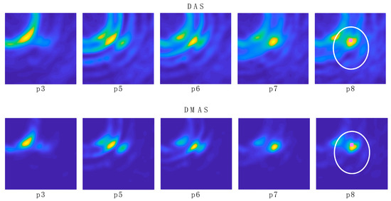 Considering the reference coordinates from the robot, Table 2 shows an error analysis for the performance of DAS and DMAS. Position p2 was excluded because the tool was still too far from the antenna system region. The mean error () and the standard deviation (σ) for each coordinate (x and y) were independently considered in this analysis. Additionally, different ranges of positions are involved, depending on the different regions where the tool navigated: p3 to p8 includes the tool travelling through the antenna system inner space, the cranium boundary, and the cranium inner space, p5 to p8 includes the tool travelling through the cranium boundary and its inner space, and p6 to p8 includes only the tool travelling through the cranium inner space.