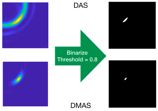 Figure 14 also shows that, after the previous image subtraction, the DAS algorithm does not provide a graphical view of the tool’s final-end position in a manner as clear and well-defined as the DMAS algorithm does. Notwithstanding that, in this case, given the simple shape of the tool, the results regarding the position detection after the binarization and centroid computation process are quite similar for both algorithms, as shown in Table 1. That being said, the visual inspection of Figure 14 suggests that the DAS algorithm is more sensible for the luminance threshold (kept constant at 0.8 throughout the whole results analysis). Indeed, lower thresholds would have resulted in a sort of half-moon-shaped white area in the binarized images, instead of the ellipsoid-shaped ones for 0.8, as shown in Figure 15. With the centroids being computed as the mass center of the white area, a lower threshold would lead to a displacement of the finally detected position; thus yielding to a greater error in the detection. Figure 14 confirms that this phenomenon is considerably less noticeable for the DMAS algorithm. The analysis of the detection error as a function of the luminance threshold is shown in Figure 18, which confirms this behavior. These results highlight the dependence of DAS on the luminance threshold and allow us to conclude that DMAS is more robust to DAS to variations in this parameter. Consequently, DMAS is expected to show a more reliable performance when tools with more complex shapes are considered, or when rotations of the tool are involved.
