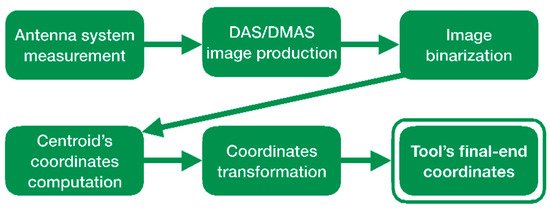 Before starting the experiment, a measurement only with the antennas, with nothing inside the system (empty measurement) was made. This empty measurement was used as the reference and calibration measurement throughout the whole experiment, and the rest of images presented in this work included the subtraction of this empty measurement. Then, two initial measurements were made with the microwave image system for the proposed setup: one only having the cranium (no tumor, no tool), and another one having the cranium and the tumor (no tool) in the right positions. During the navigation sequence, 8 measurements were made with the microwave image system at 8 different moments, so that the 8 corresponding images could be assessed. Parallell to each of them, the coordinates of the robotic arm at each moment were saved, which were later transformed to tool’s final-end coordinates for reference. Within these 8 positions, hereinafter referred to as pi, where 1 ≤ i ≤ 8, p1 and p2 had the tool’s final end out of the antenna system space, p3 and p4 had it inside the antenna system space but out of the cranium, p5 had it approximately in the cranium boundary (entering the hole), p6 and p7 had it inside the cranium and gradually approaching the tumor, and p8 had it inside the cranium and well-nigh touching the tumor boundary. Finally, the 10 resulting measurements (2 initial ones + 8 during the tool’s navigation) were processed with both DAS and DMAS algorithms. The flowchart for the imaging algorithm applied to each measurement is depicted in Figure 11.