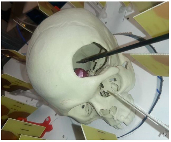 For the experimental validation, an accurate and detailed 3-D-printed model for the cranium was used (horizontal section dimensions 128 × 170 mm2), which had a hole on the left side of the forehead to enable the entrance of the surgical tool, thereby allowing us to simulate intracranial surgery. A piece of plastic filled with water was used to imitate a tumor, which was placed inside the cranium, in the inner center forehead area (Figure 9). The cranium was placed in the center of the antenna system, so that the cranium’s center coincided with the center of the antenna coordinate system, as can be seen in the picture. With this configuration, the tumor was slightly displaced from the center of the coordinate system, with the tumor’s center position at roughly (0, 26) mm coordinates considering the framework in Figure 9. The tumor had 25 × 25 × 25 mm3 dimensions.