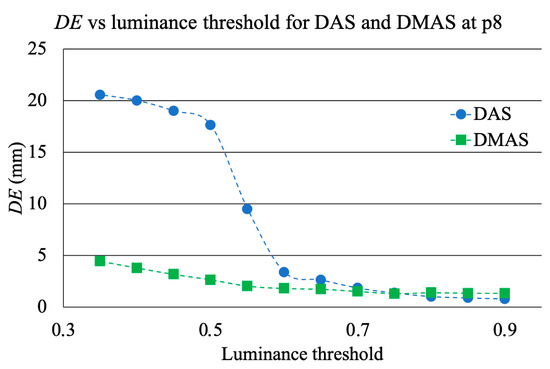 where xd and yd are the detected coordinates, whilst xr and yr are the reference coordinates. The resulting evolution of the DE depending on the luminance threshold for DAS and DMAS algorithms at p8 is plotted in Figure 18. It should be noted that this plot was made from only one measurement (p8), which was analyzed many times with different luminance thresholds. It therefore gives information about the digital error when computing the coordinates as a function of this threshold.