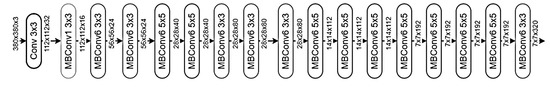 - Set , , and as constants according to the values determined in the previous step and investigate with different values of . The different values of produce EfficientNets B0–B6. Table 2 shows the input sizes and the number of total parameters for each EfficientNet model.