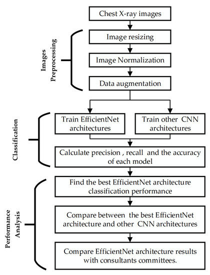 - Data Augmentation: The normalized X-ray images were augmented before introduction into the EfficientNet model for training. The process of increasing the number of original images in a collection is known as data augmentation [38,50]. This strategy helps to eliminate the overfitting problem that arises when a model learns enough from the training data but cannot classify images of undetected X-rays. Table 3 illustrates the augmentation settings used on the stain-normalized X-ray images. In this study, the number of normal images was 1010, which is twice as many as the number of TB- and sarcoidosis-infected images. Therefore, the TB-infected images were augmented from 563 to 1126, and the sarcoidosis-infected images were increased from 231 to 462.