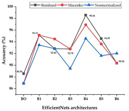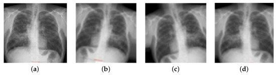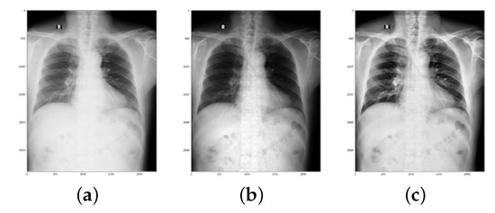 - Image Normalization: Different manufacturers of X-ray devices may provide different-looking X-ray images for the same patient. Overfitting to the device pixel distributions is quite a big problem in computer-aided diagnostic devices; therefore, it is standard practice to apply contrast normalization to minimize this problem. The general idea is to unify the distribution of pixels. This makes X-rays appear a little darker. This procedure generates a view that radiologists would not see in their standard workplace. Using the Reinhard and Macenko approaches, X-ray images were stain-normalized [43,48,49]. A reduction in the color discrepancies of X-ray images improves the classification accuracy of EfficientNet models.