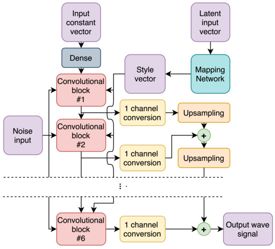 One of the notable shortcomings of the original GANs is the relatively low amount of control that the user has over their output, as they are trained to generate data based on random input. StyleGAN [23,24] addresses that limitation with the introduction of “style vector”. The neural network is instead initialized with a constant vector, and the random input is fed into a trainable mapping network (MN), a multilayer perceptron that is trained to output the style vector. It is then fed into the generator at multiple points corresponding to various detail levels of the synthesized data. Since both the generator and MN are trained together, this results in the MN learning to create a mapping process between random noise and an arbitrary set of features that the generator can use as a basis for the synthetic data. These styles are applied to the model at multiple scales to influence both large-scale elements and fine-grained details, which, in the case of images, could refer to the background, color palette, or various objects, and in the case of time-domain signals, various frequency bands. Once training is done, the mapping network is no longer necessary and the values of the style vector can be manipulated directly, giving the user control over the contents of the data produced by the generator.