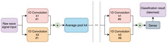 Just like the generator, the discriminator is built out of six similar blocks, with its structure being the “reverse” of the generator, starting with small filter counts and ending with large ones. The other three key differences are not using weight demodulation, utilizing average-pooling operation in place of bilinear interpolation for changing the size of the signal as it passes through these individual blocks, and using skip-connections [55] instead of passing the entire residual signal across the whole network. The regular convolution layers have a kernel size of 3, while those on residual connections have a kernel size of 1. The schematic of the discriminator can be seen in Figure 3.