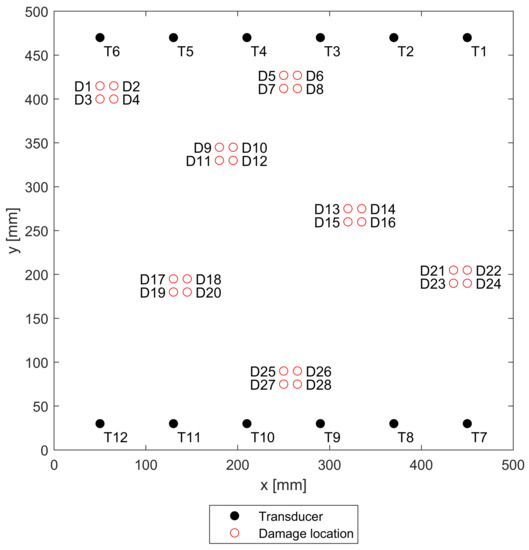 OpenGuidedWaves dataset [5] was used in this work due to the sheer amount of data it offers, especially when it comes to the amount of diverse damage position scenarios in a controlled environment. The dataset comprises guided wave measurements performed on a square carbon-reinforced polymer plate with dimensions of 500 mm × 500 mm and 2 mm thickness. It has 12 piezoelectric transducers embedded along two of its opposite edges. Besides the wide spectrum of recorded excitation frequencies (60 kHz–240 kHz), the dataset also contains a large number of damage scenarios, with a total of 28 distinct damage states (see Figure 4), realized via attaching magnets to the monitored object. For the exact details of the plate and signal acquisition, the reader is invited to read the detailed dataset specification [5].