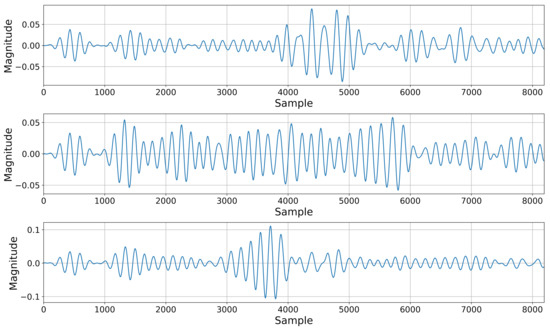 The simplest method of generating data with GANs is to utilize random noise as an input, exactly as is done during the training. The examples of such generation indeed resemble guided wave signals and can be seen in Figure 5. Though producing signals in this way has limited utility, it is a good way to check whether the training was successful. It is also apparent that the training avoided mode collapse—a phenomenon where the generator “collapses” into producing a single signal regardless of the input, as it is the easiest way to fool the discriminator.