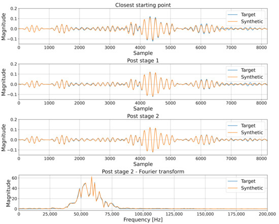 Next, the reconstruction capabilities were tested on validation signals—signals that the network has not seen during the training. The purpose of this test was to verify whether the network overfit the training dataset and would only be able to recreate the signals it has seen, or if it modeled the underlying problem and is able to generate different signals correctly. The signals were generated using the process outlined in Section 2.3.3, and an example of such reconstruction together with the two-step breakdown is presented in Figure 6.