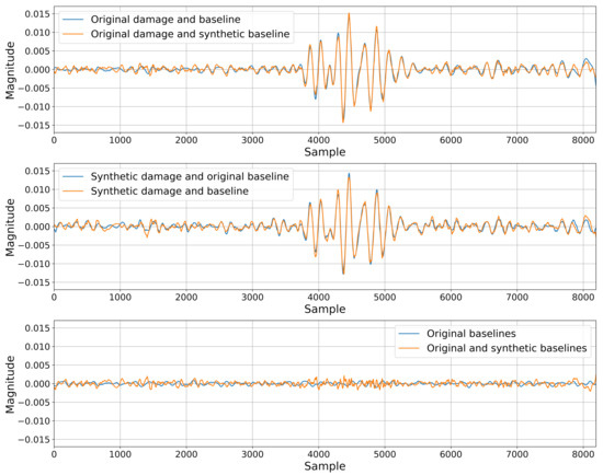 The guided wave signal synthesis appears to perform well at every step, producing believable signals via random generation (Figure 5) and accurately reconstructing given signals that it had seen during training (Figure 6) as well as ones that it had not yet encountered (Figure 7), carrying relevant information about present damage or lack thereof. The fact that it was able to accurately reconstruct the damage scenarios that it had not previously seen suggests that any given damage scenario may exist in the space modeled by the GAN. Currently generating signals for arbitrarily picked damage positions has not been tested; however, formulating a robust control method would allow for a synthesis of other damage scenarios or even sensor paths placed in any position on the monitored object.