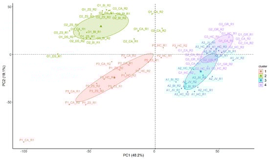 To evaluate the distribution of the samples in the space, a principal component analysis (PCA) was performed by using the same data matrix (D76×4190). In Figure 2, the samples were represented according to the first two principal components (PC1 and PC2) which represent 48.2% and 19.1% of the variability of the data, respectively. The samples were colored based on the group obtained by the previously selected clustering method (model-based clustering with four groups and VVI distribution). In addition, this figure also shows the group assigned to each cluster as well as its distribution and centroid.