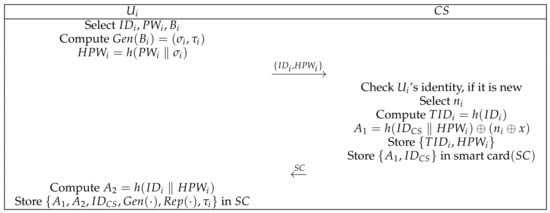 At this phase, registers with as a legal user. The user transmits the parameters calculated by themselves to via a secure channel and finally obtains the smart card issued by . Figure 3 detail the process. The specific process is as follows: