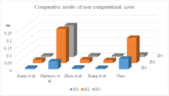 We calculated the time required by the user and server. To estimate the user’s computing cost, we developed an app that uses the Java pairing library, signature library, and symmetric encryption/decryption function to calculate the running time of various operations. We used smart phones produced by different manufacturers to imitate the user. We ran various operations on the following mobile phones ten times and used the average value as the reference time. Table 4 lists the results of various operations on different mobile phones. D1 is a Huawei Mate 30 mobile phone with a harmony operating system, Huawei Kirin 990 processor, and 8G running memory; D2 is a Redmi Note 9 Pro mobile phone with an Android operating system, Qualcomm Snapdragon 750 g CPU, and 8G of RAM; and D3 represents a Oneplus phone with an Android operating system, Snapdragon 865 processor, and 8G running memory. Table 5 and Figure 9 present the comparative results of the client calculation costs of the five protocols. Table 5 shows that the protocol of Amin et al. [13] requires , the protocol of Martinez et al. [17] requires , Zhou et al.’s [18] protocol requires , Kang et al.’s protocol [19] requires , and our proposed protocol requires . Although we are not as good as Amin et al. [13], Zhou et al. [18], and Kang et al. [19] in terms of performance, we are better than them in terms of security.