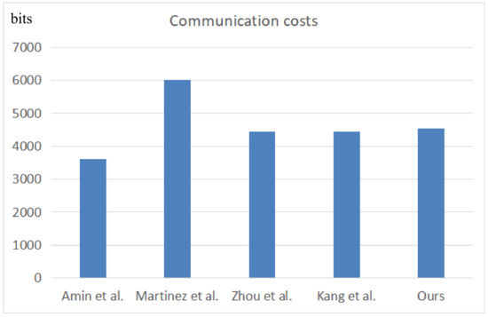 To calculate the communication cost, we set the length of one-way hash H as 256 bits, timestamp T to 32 bits, string s to 160 bits, identity to 160 bits, random number to 160 bits, and encryption operation E to 256 bits. In addition, assume that the fuzzy extractor needs to store 8 bits. From this definition, the protocol of Zhou et al. [18] can be concluded to require , that of Amin et al. [13] requires , that of Martinez et al. [17] requires , that of Kang et al. [19] requires , and our protocol requires . Table 7 and Figure 10 present the detailed comparison results. Evidently, our protocol has a lower communication cost than that of Martinez et al. [17], although the communication cost is higher than that of the other three protocols. Our protocol also provides higher security; their protocols have been proven to have various security problems. Therefore, our proposed protocol is secure, has a relatively good performance, and is suitable for cloud computing environments.