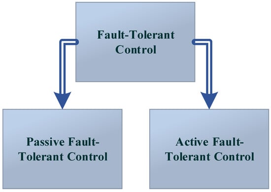 The passive fault-tolerant control system (PFTCS) and the active fault-tolerant control system (AFTCS) are the two main types of FTC []. These are implemented and described by many authors in [,,,,] as mentioned in Figure 1.