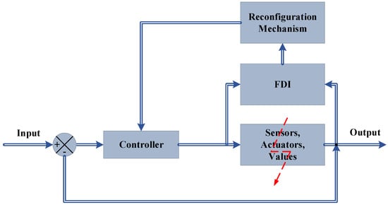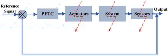 In PFTCS, the fault is tolerated in such a way that the controller is robust to certain parameters and provides robustness despite the faults being occurred []. The implementation of such a control is executed in [,,]. The PFTCS block diagram is shown in Figure 2.