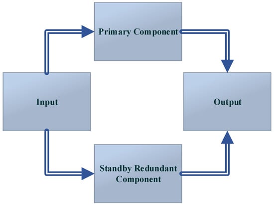 The system’s reliability is increased by the hardware redundancy as it removes the fault in the primary equipment by replacing it with secondary equipment. The number of components installed in parallel, for the hardware redundancy, determines its type. If two components are installed, then it is called dual redundancy, as shown in Figure 5. Adding more components in parallel is also possible, in which triple modular redundancy (TMR) is a popular technique, but it increases the overall cost, space, and weight of the system and is recommended only after a proper cost/benefit analysis [].
