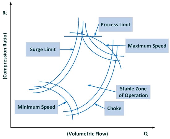 Different sensors play a vital role in the calculation of the surge. Combining the equations of these sensors, we formulate the virtual values for the AFTCS. The design of an advanced compressor control system is shown in Figure 7, in which the objective is to keep CC to the right of the anti-surge control line. If the operating point crosses this line due to surging conditions, backup lines operate further control actions to open the ASV so that the operating point is driven to the right [].