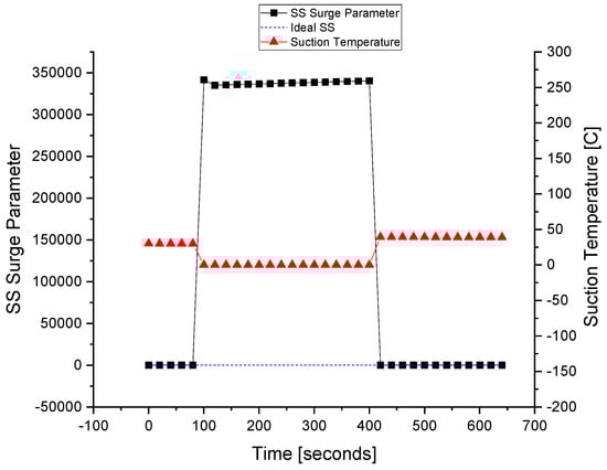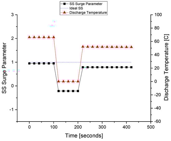 The discharge temperature sensor is made faulty with FIU, as shown in Figure 17. At about the 110 s of the simulation, the fault is injected into the Td sensor; at that time, the fault tolerance is kept out of the system to differentiate between the faulty and fault-tolerant conditions. At about the 210 s of the simulation, the FTC is turned on and the value of the sensor is replaced with that of the estimated model running in parallel with the FDI unit. It can be observed that the value of the surge parameter also deviates during the fault occurrence, and it regains its value using the estimated value of the sensor that is provided by the equation models.