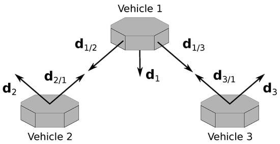 Consider a formation with three vehicles, where , , and are the body-fixed frames of the respective vehicles and represents the inertial frame. In the proposed framework, there are two kinds of measurements: one is a line-of-sight (LOS) vector that points to the position of another vehicle, and the other is an inertial reference vector—for example, a known physical field direction. All measurements are unit vectors obtained in the respective body-fixed frame. Moreover, the inertial references are known in the inertial frame.
