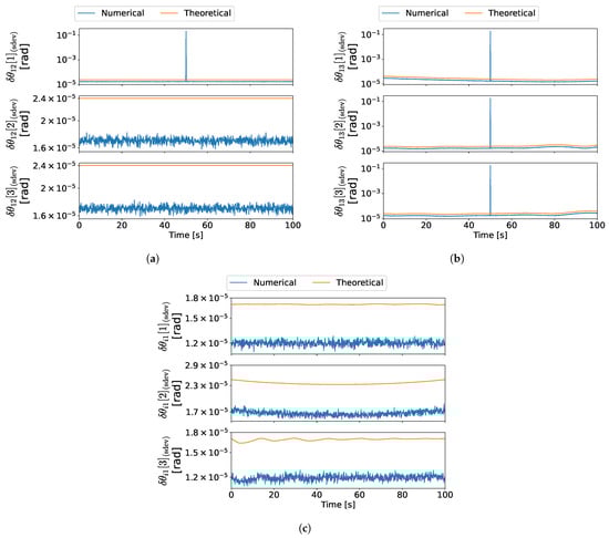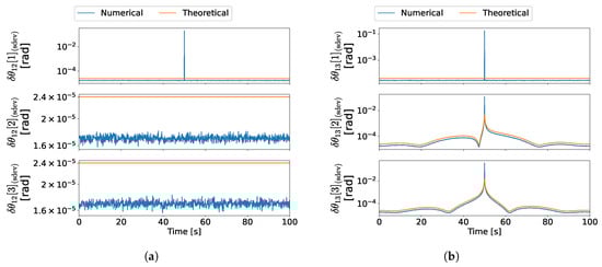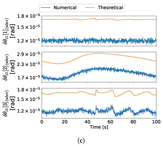 In the second experience, there is a coplanar configuration at 50 s, which is analogous to the depiction in Figure 3. Similarly to the degenerate configuration in the first experience, the information provided by the measurements becomes gradually insufficient to determine all three axes of . Hence, it is expected that both the theoretical predictions and the numerical results are analogous. As seen by comparing Figure 7b with Figure 6b, the results are indeed similar to those obtained in the first experience. Furthermore, the theoretical errors are close to the numerical errors for all attitudes except for the configurations where the analysis is not valid close to the 50 s time instant.