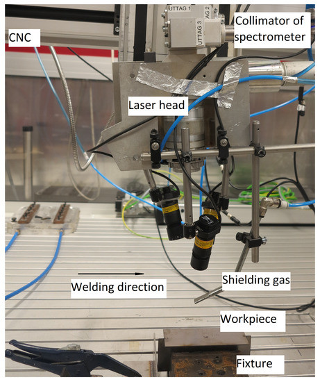 Compared to photo-diodes, spectrometers can resolve the incoming signal and separate each wavelength, providing the possibility to get more information about the state of the process, such as the plasma electron temperature [39,40]. In addition, the high dimension of discrete vector data acquired by the spectrometer enables the usage of advanced signal analysis methods, such as ML. The spectrometer is low-cost and can be easily implemented in a welding tool since it is a compact and non-contact device. The spectrometer used in this work, is equipped with a 2048 pixel CCD array detector and 10 µm entrance slit. It collects light in the wavelength range between 400–530 nm with a spectral resolution of 0.07 nm. The welding setup for the experiments is presented in Figure 2.