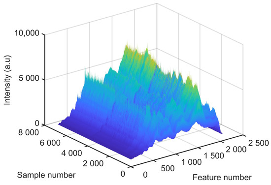 Time series of spectral data acquired during the tests. Each feature represents discrete wavelengths of the spectrum while the sample number represents the time sequence acquired during the tests.